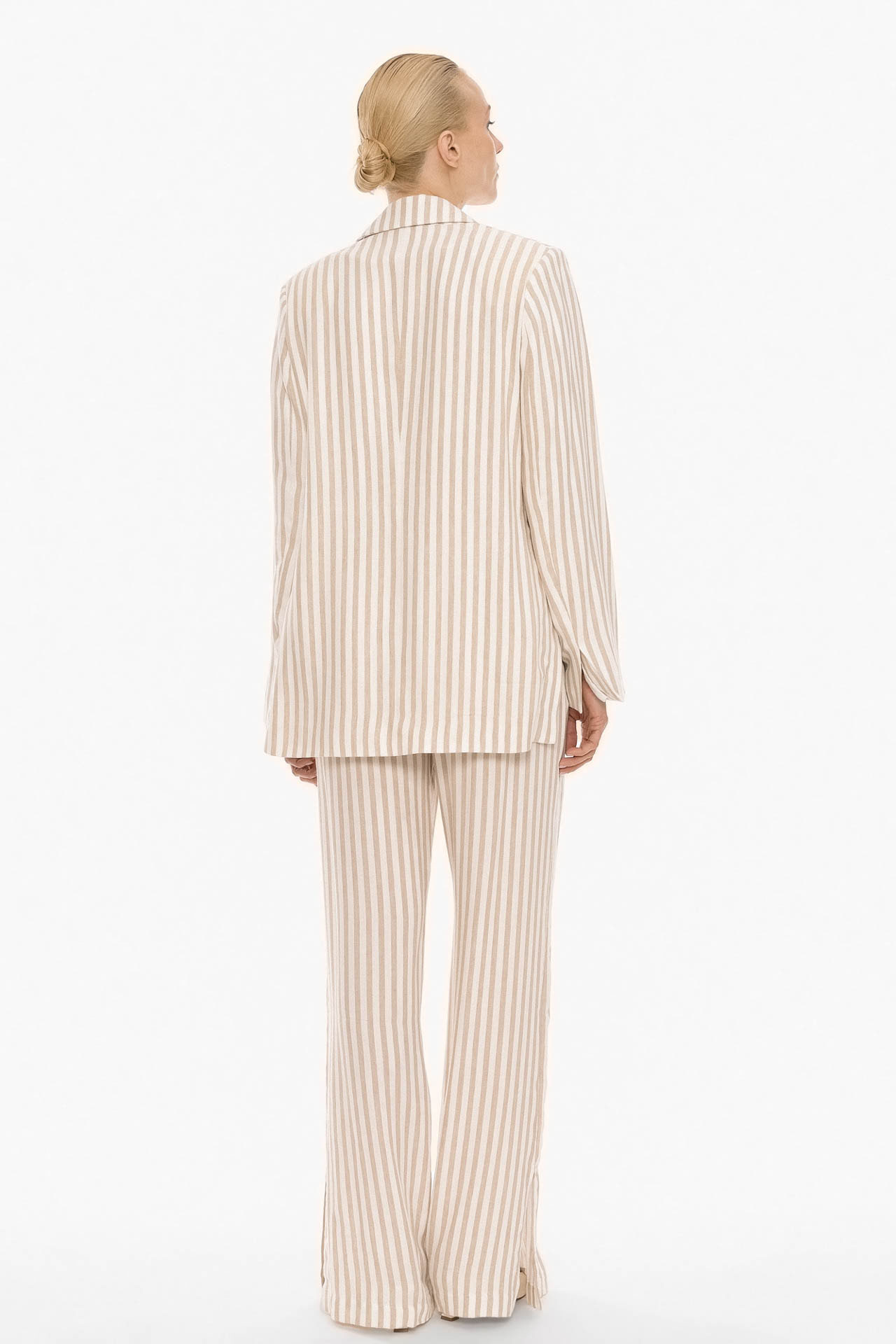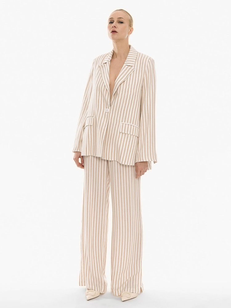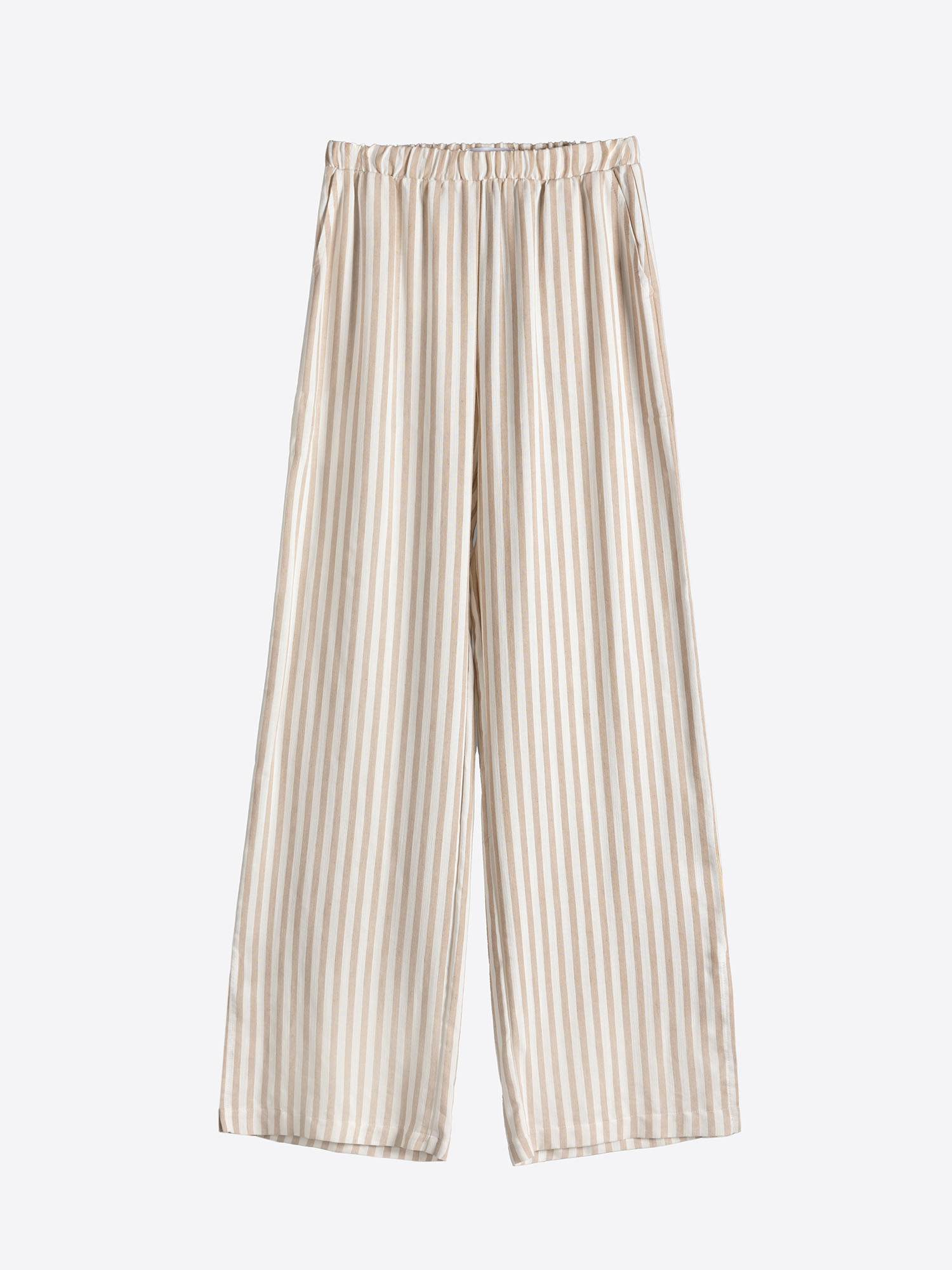 These striped trousers crafted from lightweight, breathable fabric, they feature a soft vertical stripe patter. The relaxed fit and wide-leg design provide ease of movement.