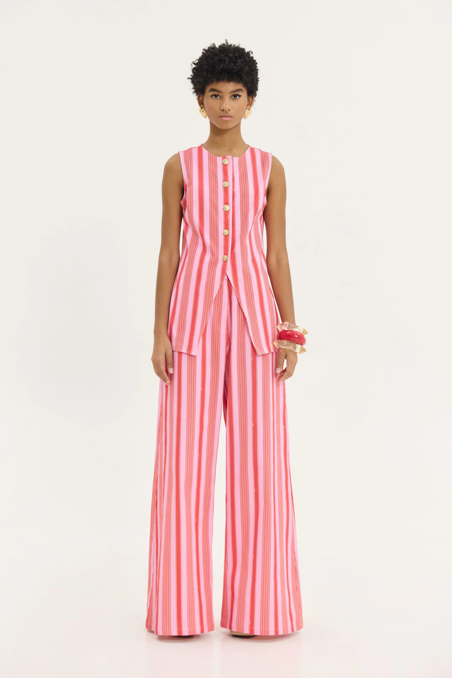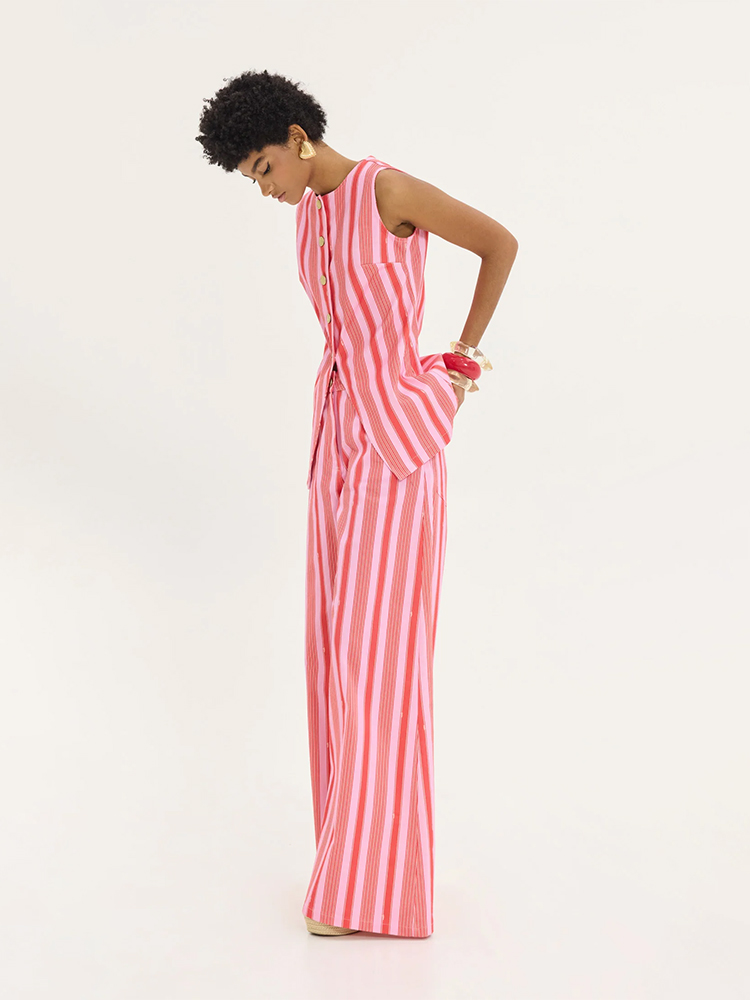 A bold yet effortless denim piece designed from Hemithea to stand out. The relaxed wide-leg fit combined with soft pink stripes creates a modern, fashion-forward look that moves easily from casual styling to elevated outfits.
