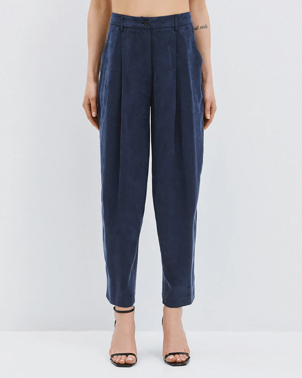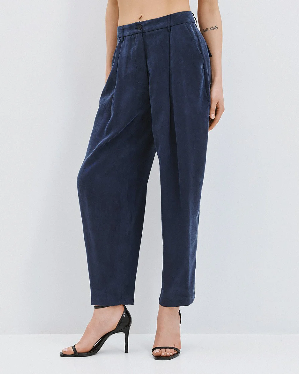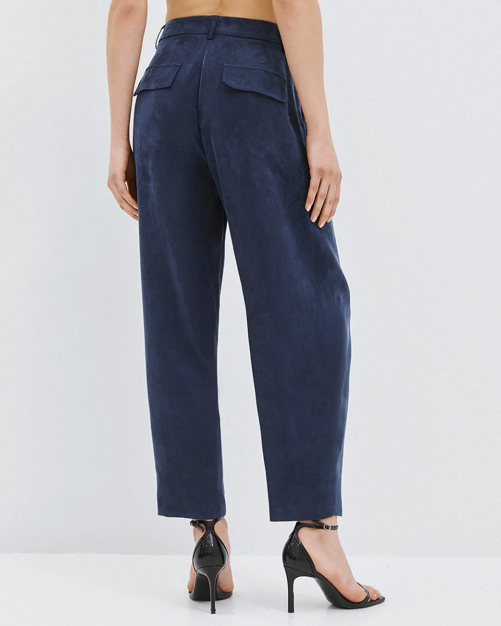 Slouchy pants with front pleats and side pockets. Features decorative back flap pockets, belt loops and a front zip and button closure.