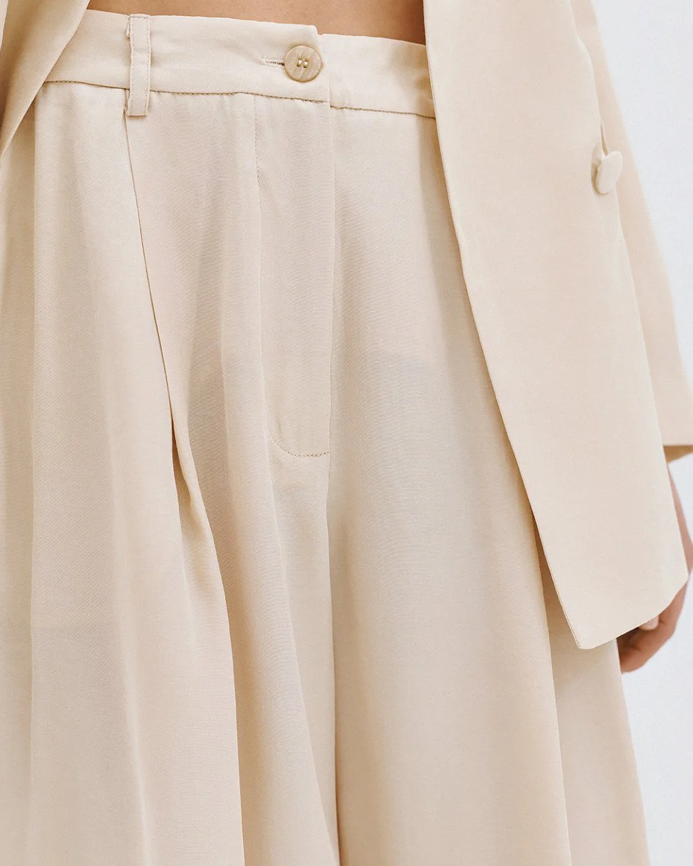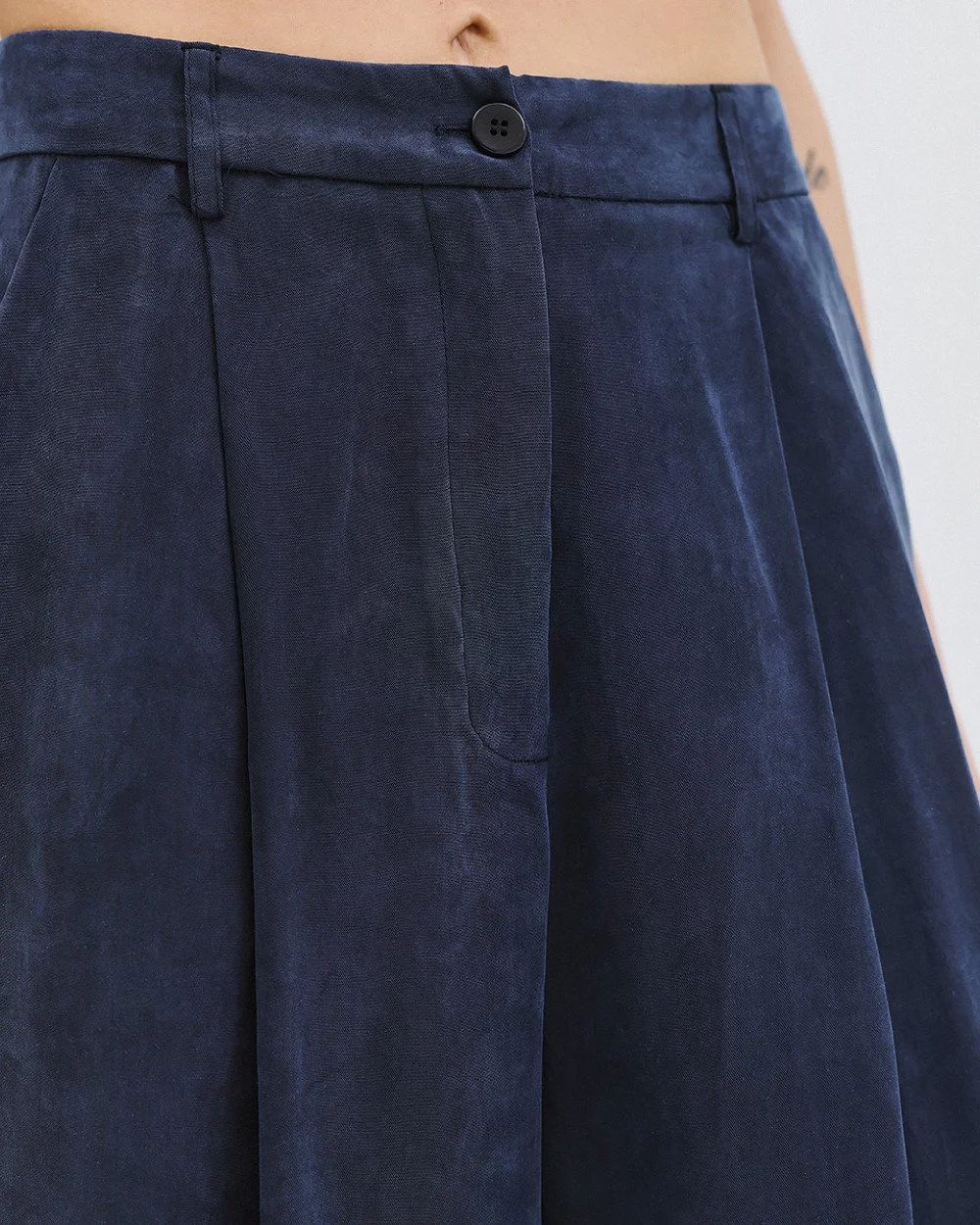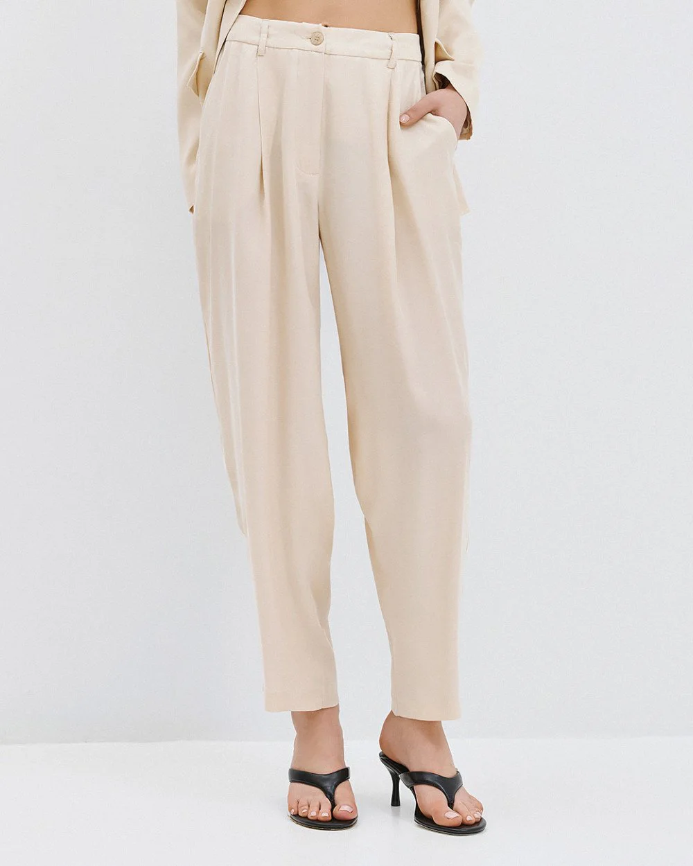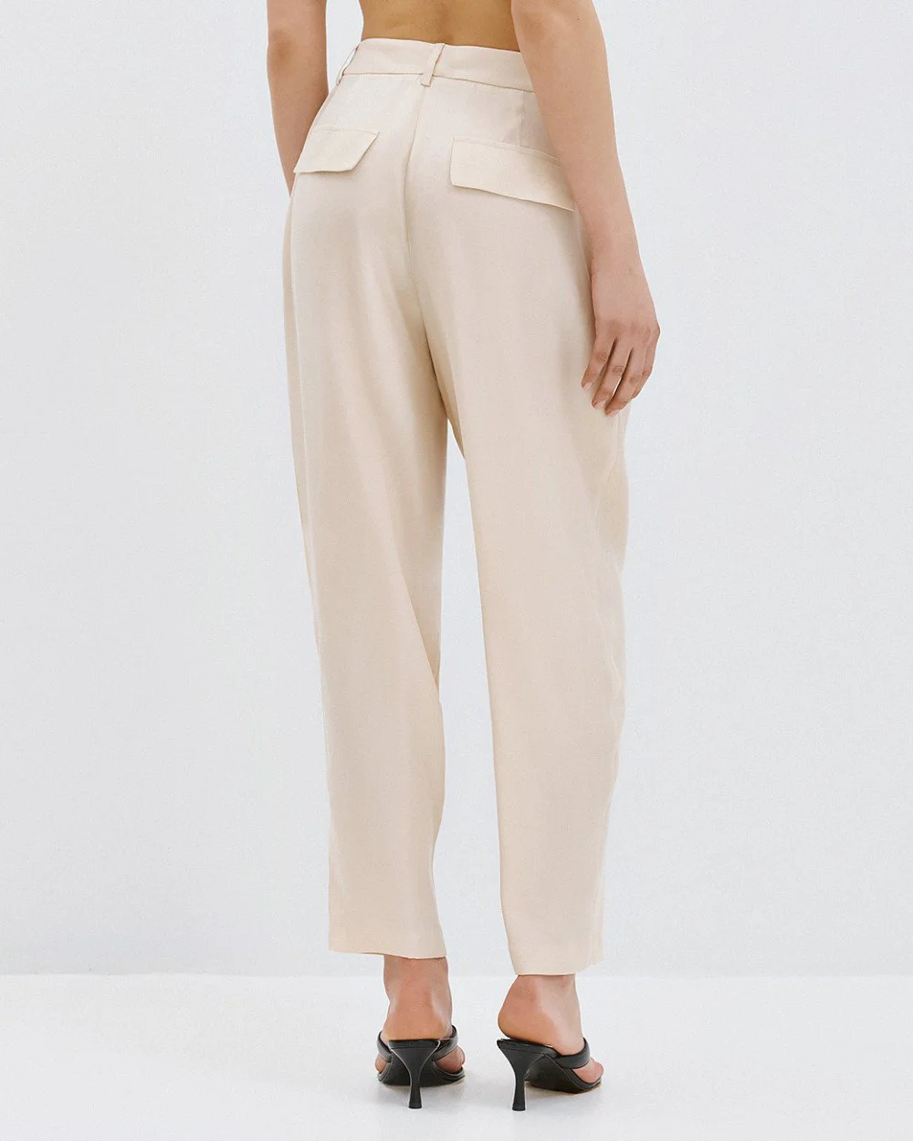 Slouchy pants with front pleats and side pockets. Features decorative back flap pockets, belt loops and a front zip and button closure.