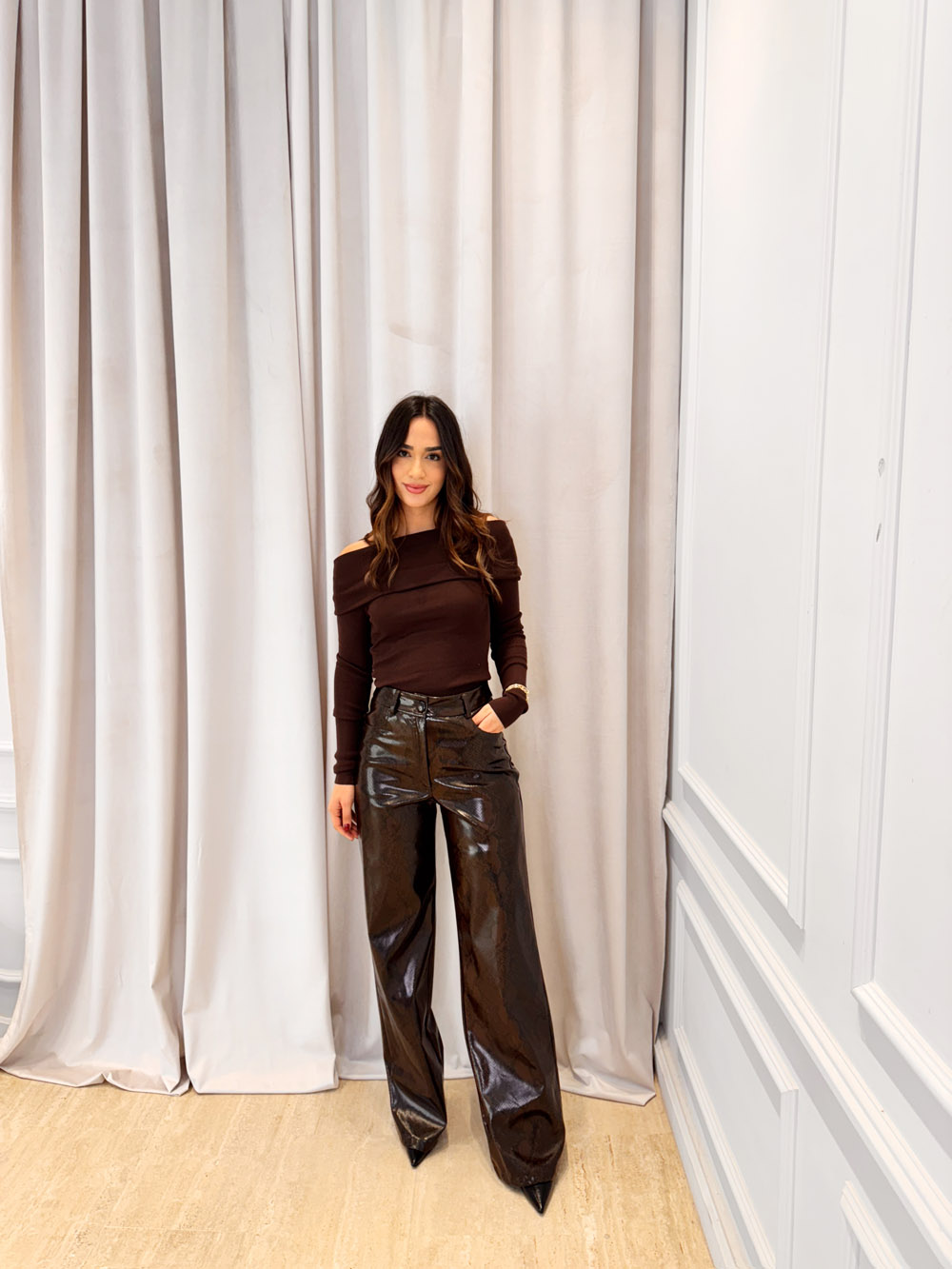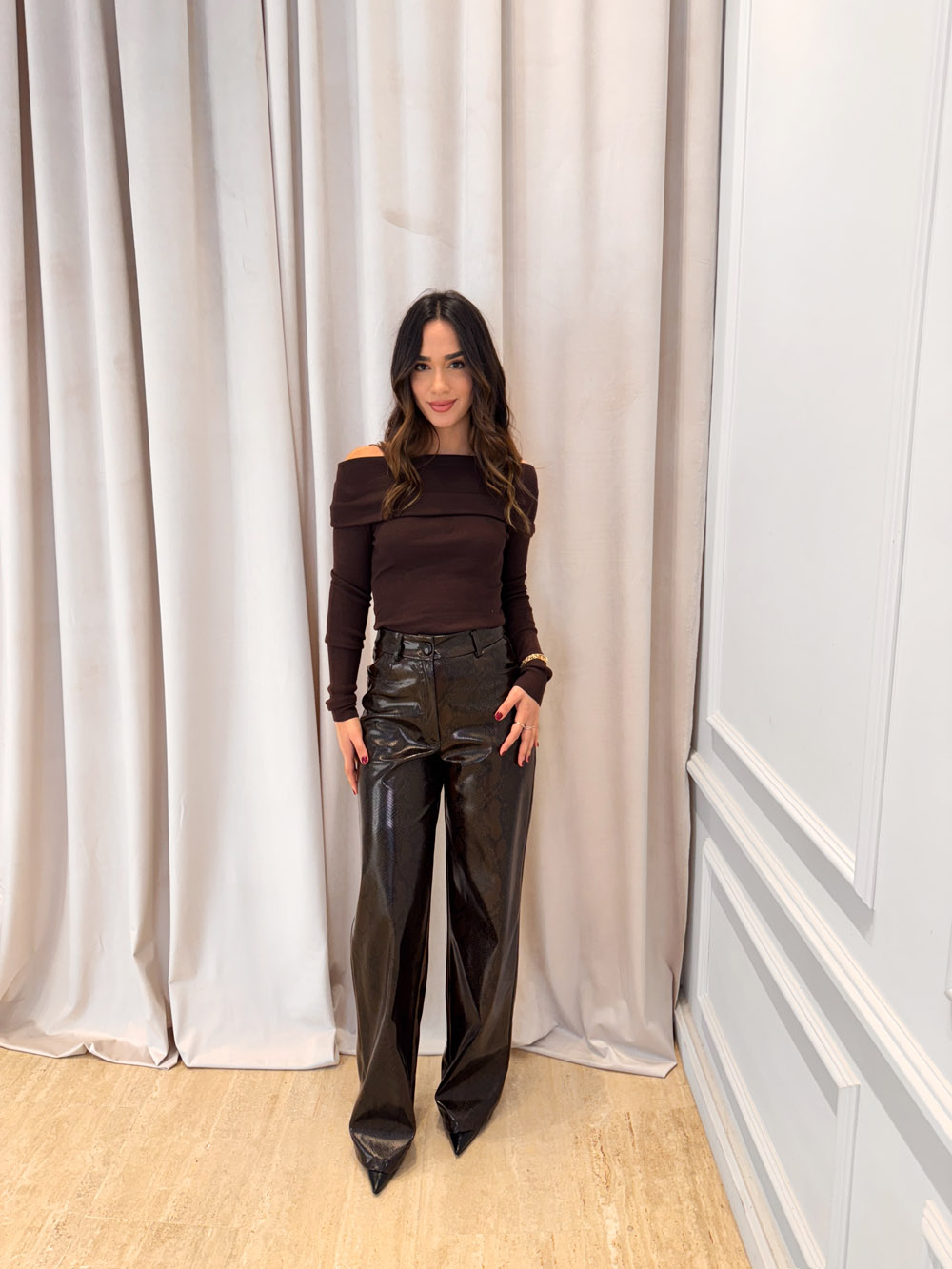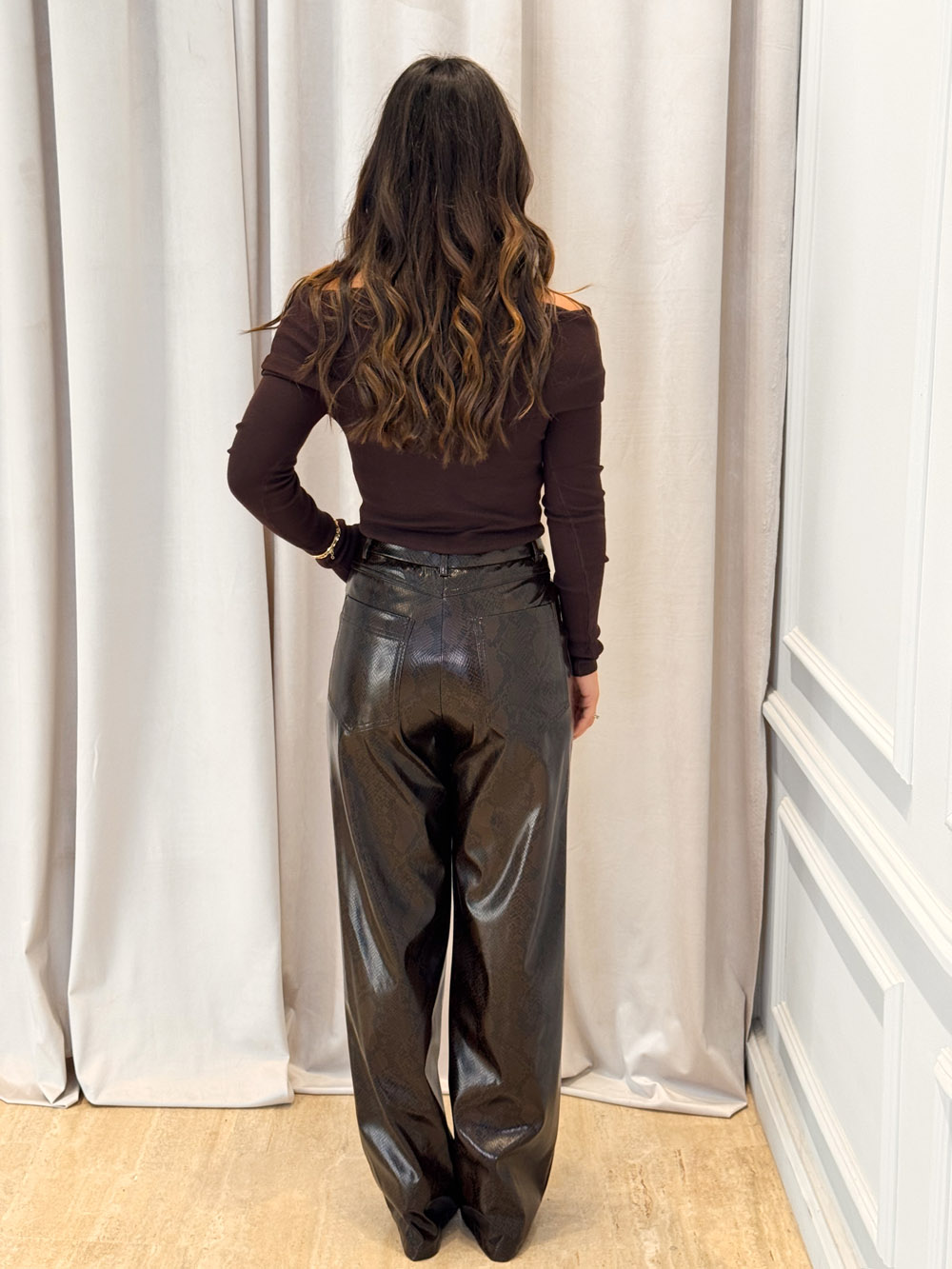 Snake-print eco-leather trousers with high waist, a sleek straight-wide leg, and a glossy embossed texture. The structured waistband, belt loops, front button closure, back zipper and functional pockets mimic the timeless silhouette of classic trousers.