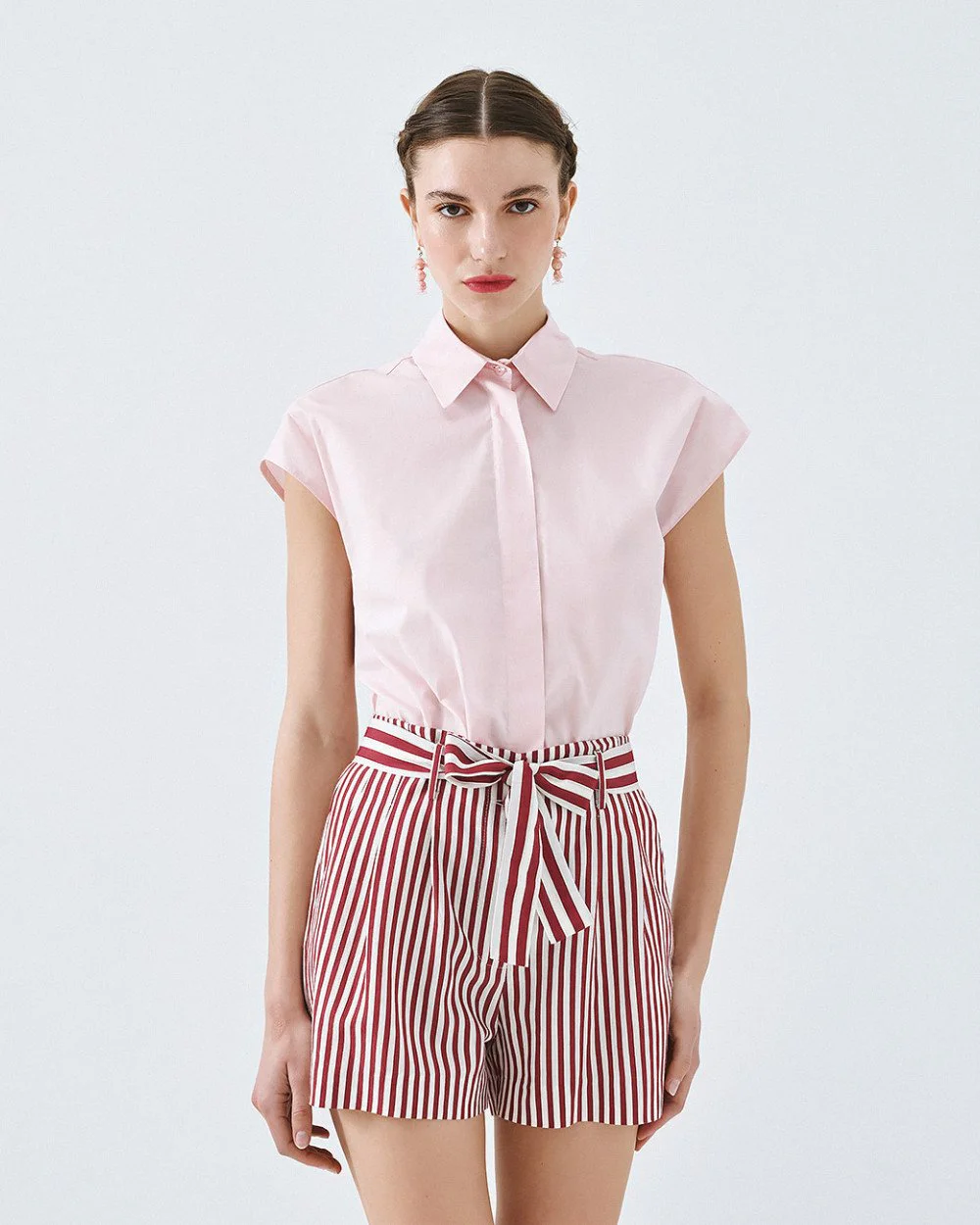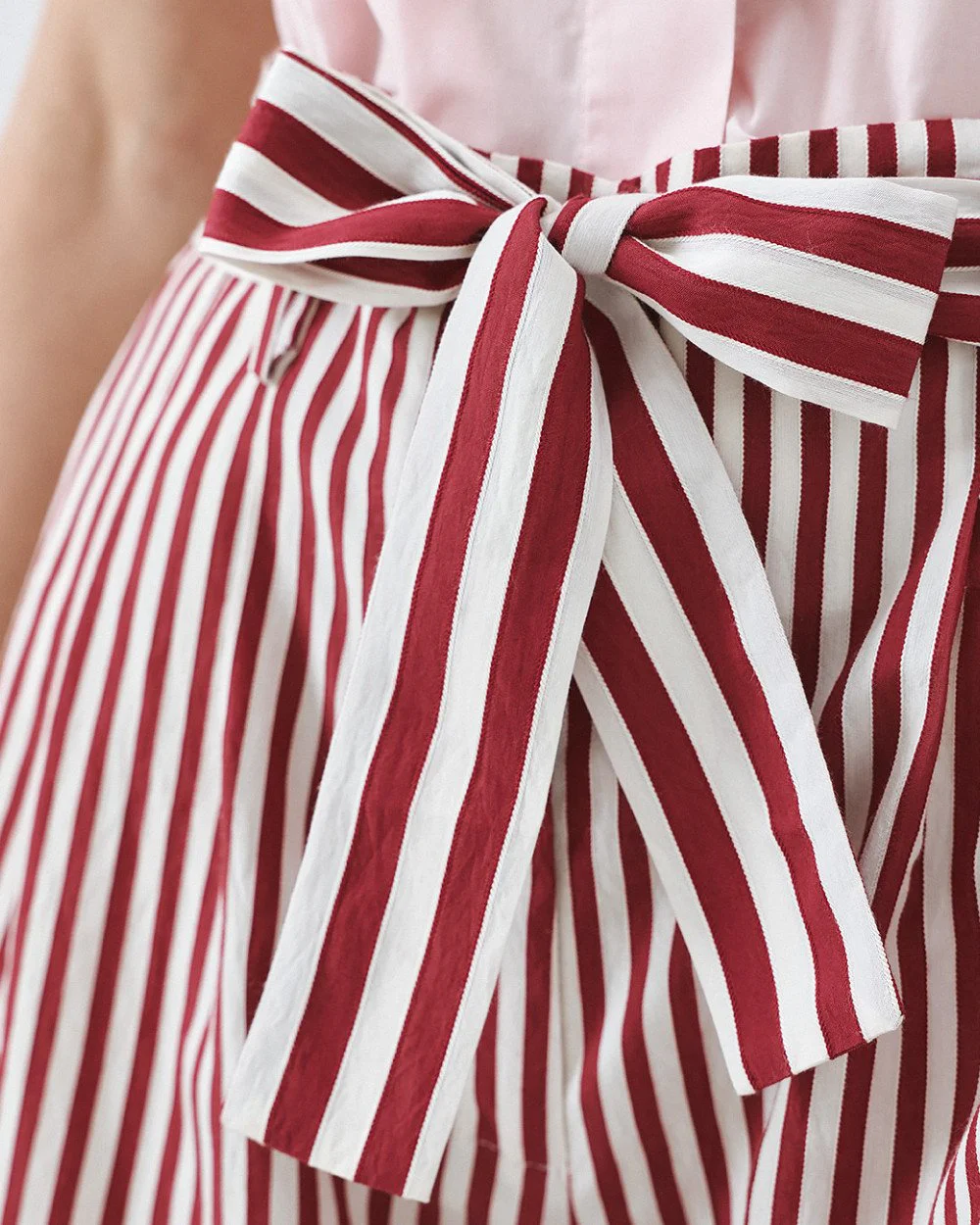 Striped shorts with side pockets and decorative welt pockets at the back. They feature belt loops, a removable tie belt, and a front zip and button closure.