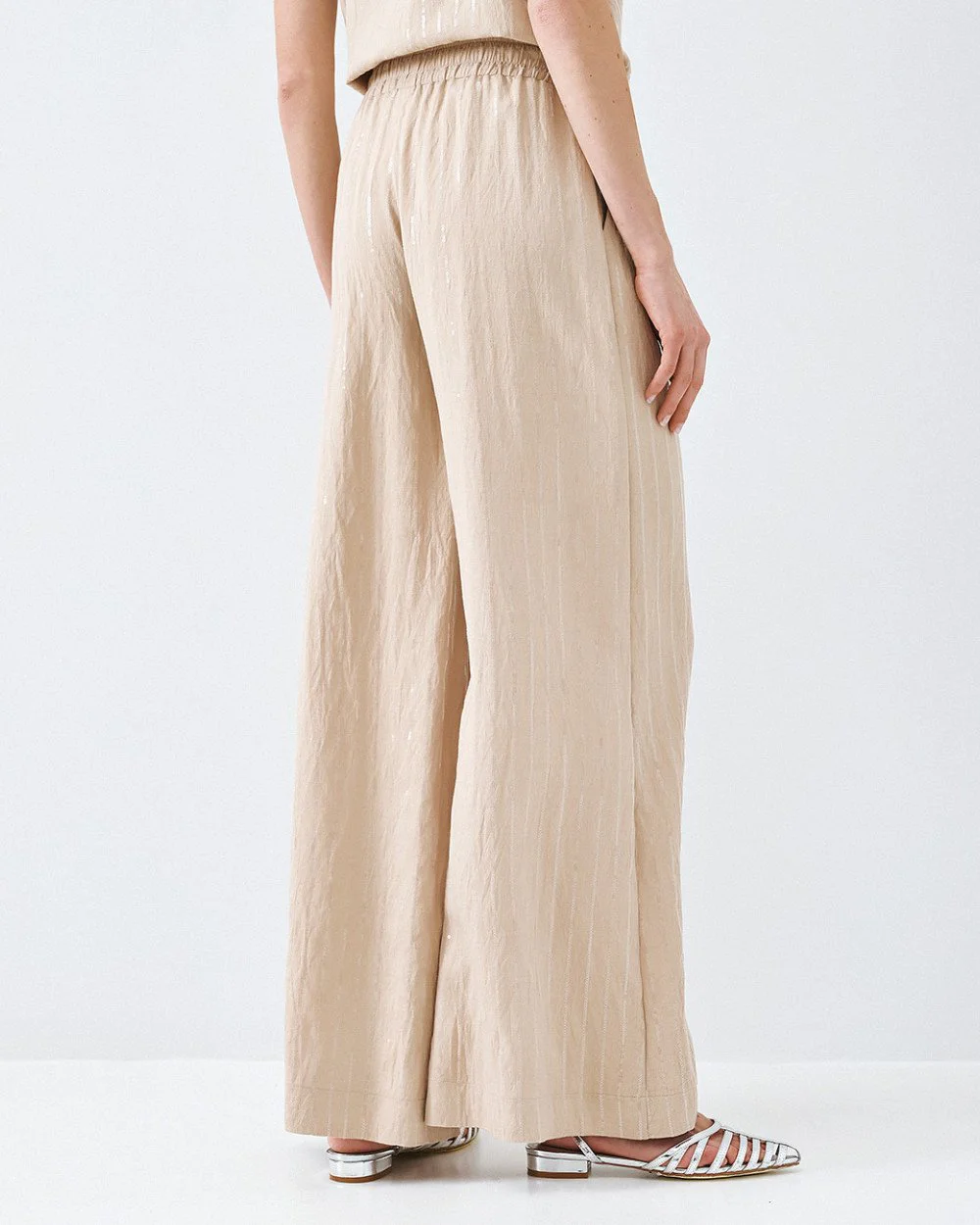 High-waisted wide-leg pants with embroidered sequin stripes. Features side pockets and an elastic waistband.