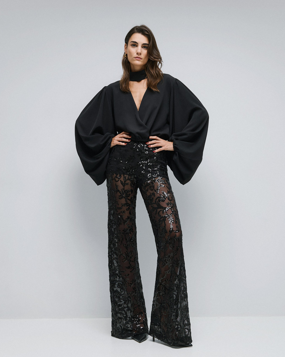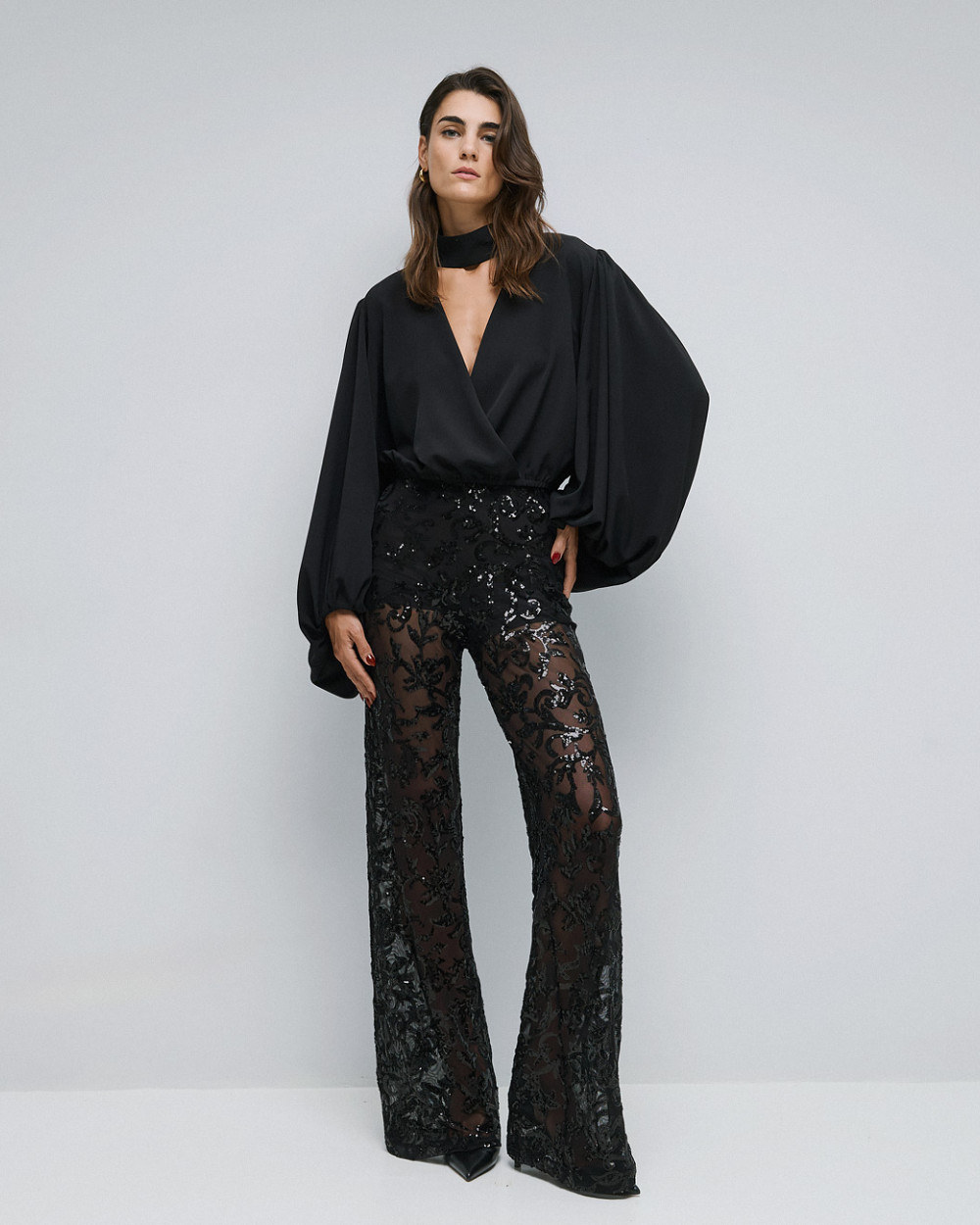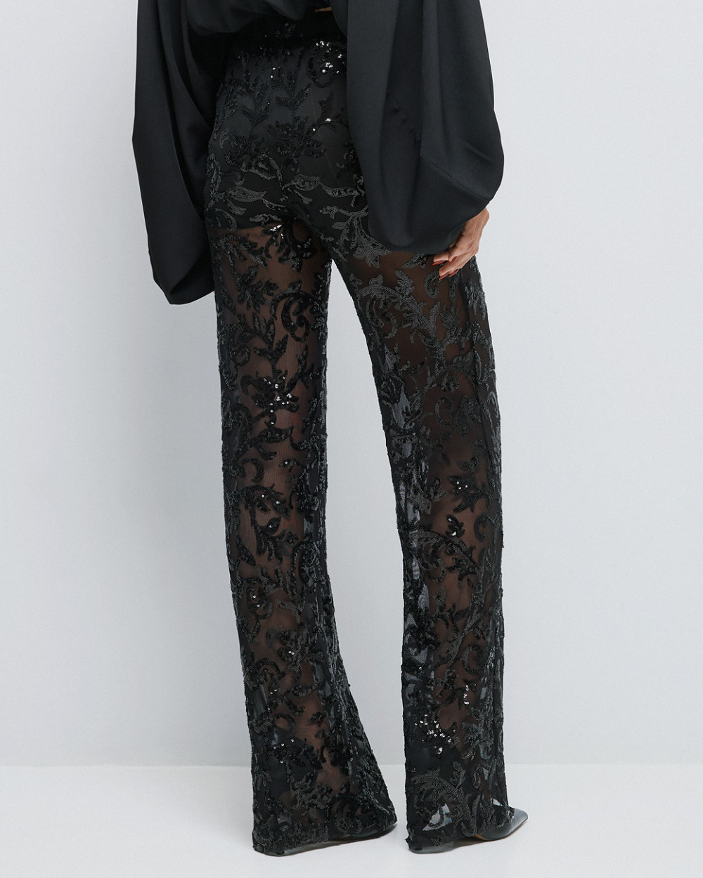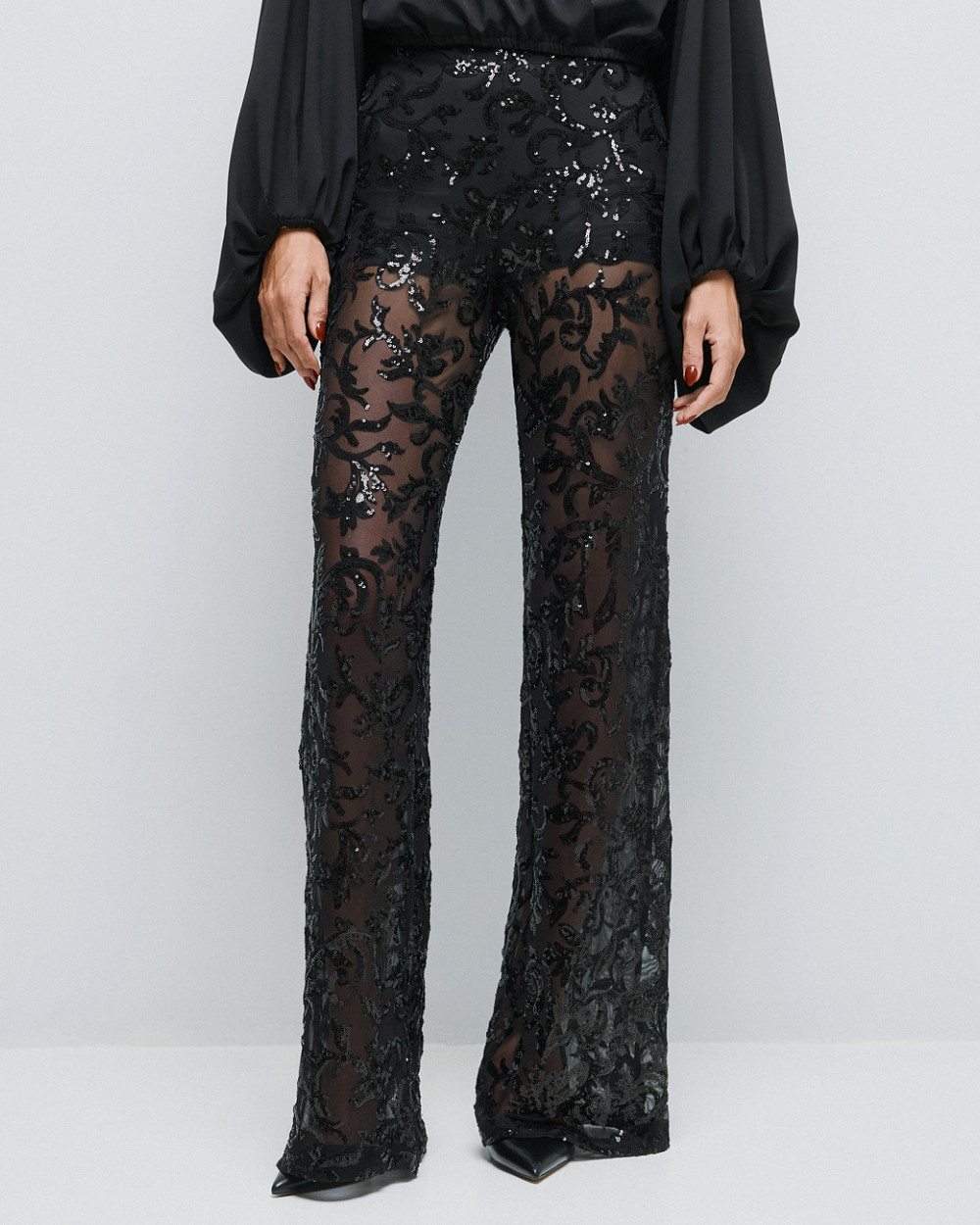 High-waist tulle pants with embroidered sequins. Featuring an elastic waistband and detachable shorts lining. An ideal choice for glamorous evening looks.