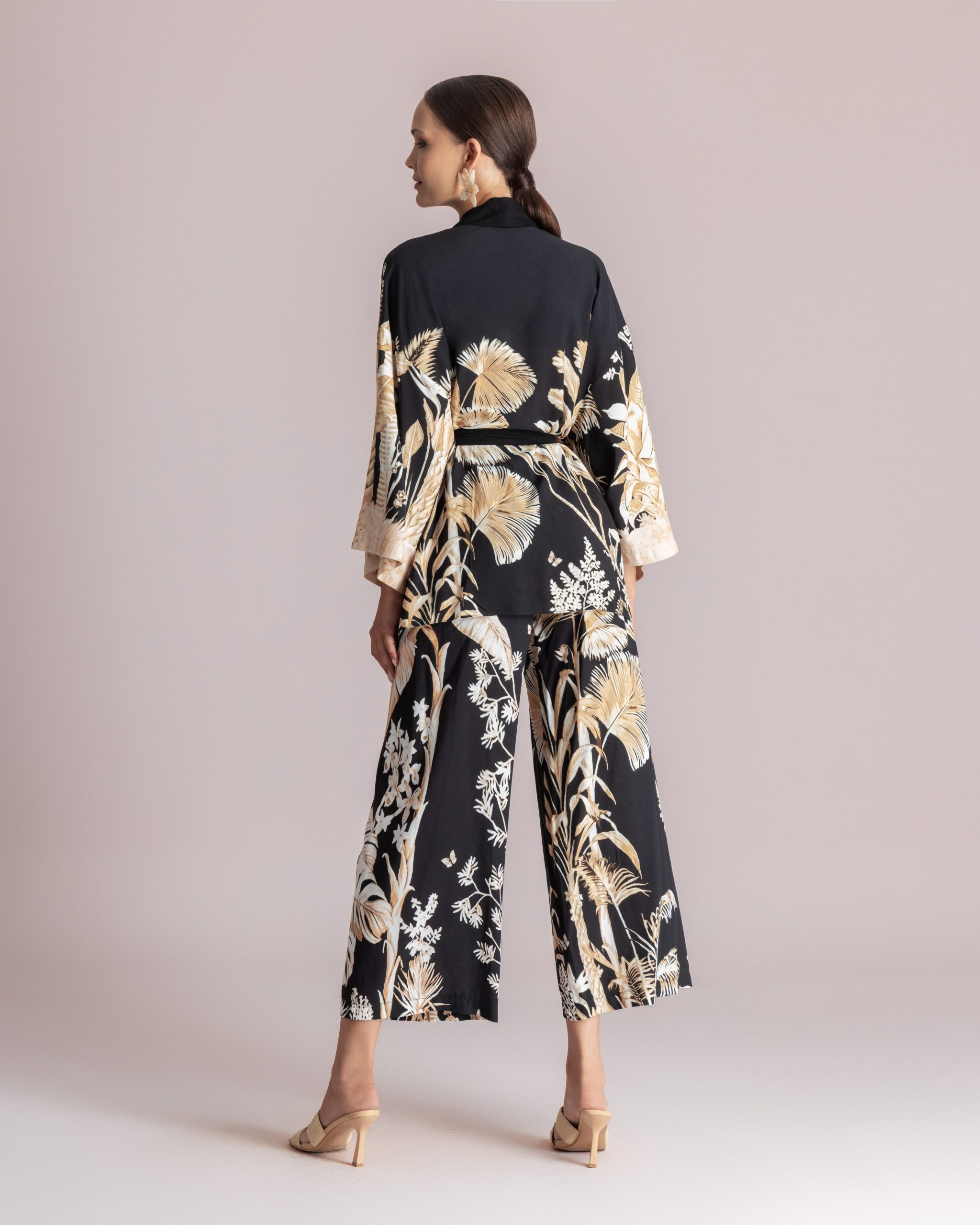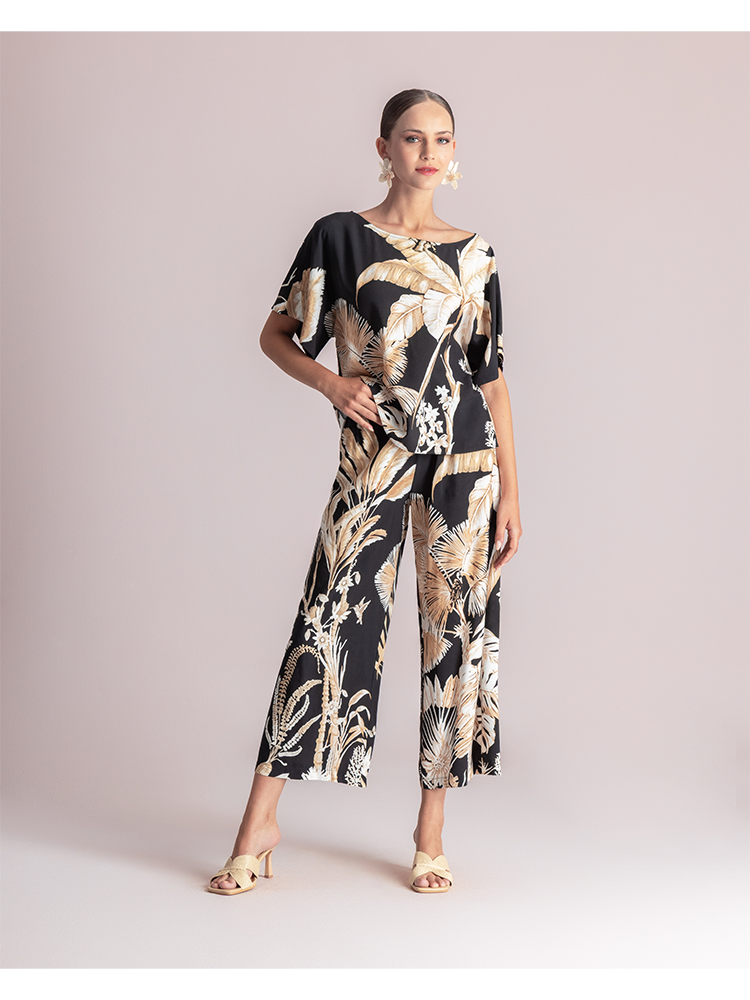 Wide-leg trousers, designed in a striking black base with soft beige botanical prints. The cropped length and flowing silhouette create airy feel.